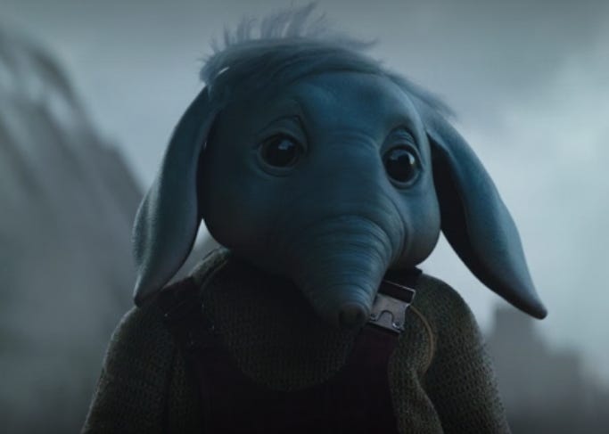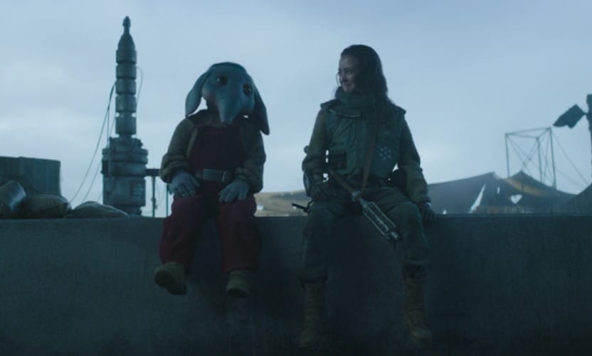 Which leads us to the fourth episode of Skeleton Crew, titled "Can't Say I Remember No At Attin." A phrase SM-33 is fond of saying. Jod and the kids think they’ve finally found At Attin, based on the coordinates they “borrowed” from Kh'ymm. Turns out, it’s At Attin but in the Upside Down. They’re actually on At Achrann. Not so much a jewel of the Republic anymore. At Achrann is a bombed out, desolate planet that may or may not have been ruled by King No Head. Which is a line I loved because it’s absolutely kid logic. Maybe the statute was a king. It’s missing a head. Gotta be King No Head. The kids discover that At Achrann has a forever war going between the Troik and the Hattan, the Hatfields and McCoys of At Achrann. The leader of the Troik, General Strix, doesn’t have any real problem using kids on the front lines while he leads from behind. Wim thinks this is awesome. Fern and KB are less enthusiastic, but can’t see any other choice.