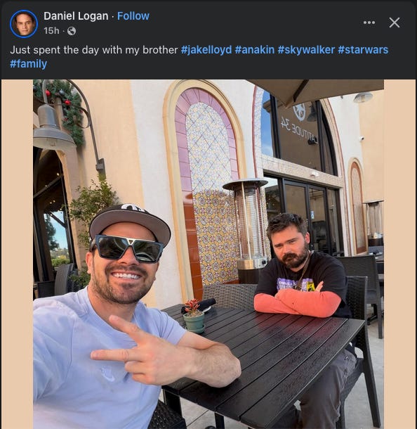 That’s Daniel Logan, aka Baby Boba Fett in Attack of the Clones along with Jake Lloyd aka young Anakin Skywalker. Logan has talked before about befriending Lloyd and trying to do what he can support him as Lloyd struggled with mental health issues and schizophrenia. As Logan told fans at GalaxyCon Richmond:
