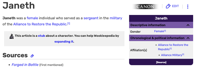 Yup. That’s all we got. For all you Jeneth-stans, sorry there isn’t more. Take it up with Wookieepedia, not me.