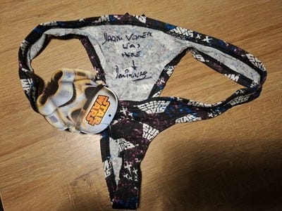 I went back and forth about posting this one. Ultimately, it’s funny and while there are probably some who could be offended by it. It’s not really risque. It’s PG-13 which is how I try to keep Death Star HR. A woman across the pond in Great Britain is selling on eBay an (unused thankfully) Star Wars thong signed by David Prowse.