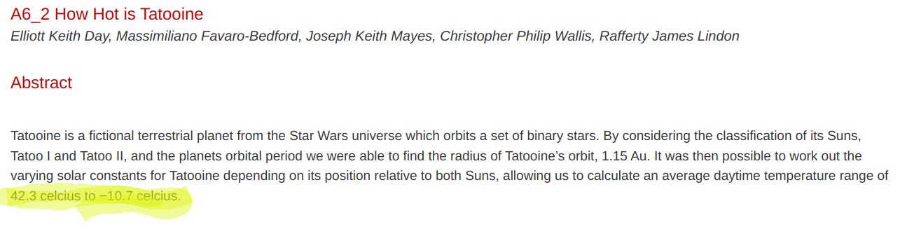 The font is a little small if you’re reading this on your phone. But they suggest a high of 42.3 Celsius. A high of 42 in Mos Espa translates to roughly 107 degrees on Earth. Man, that’s hot. Who would be dumb enough to live in that kind of hellscape?.