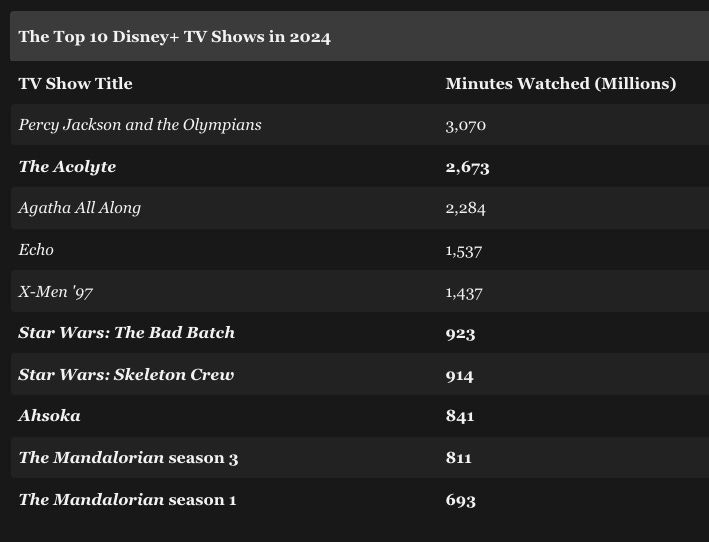 But their presence in the top 10 indicates something about the health of Disney+ as a streaming service, and it's not good. The Acolyte came second in a year in which Disney+ as a whole underperformed.