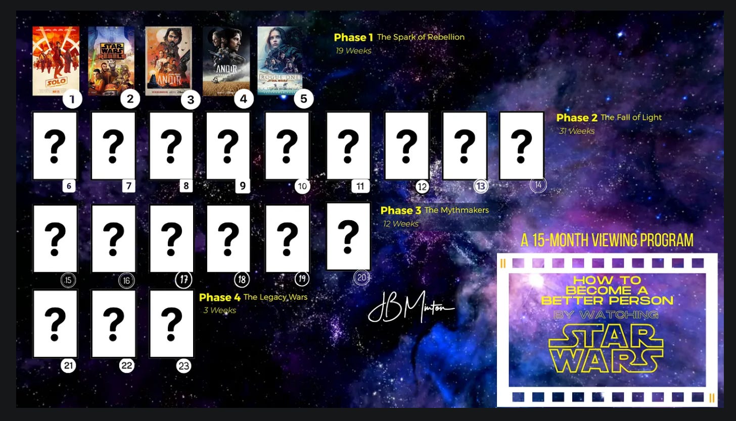 has put together a what he has titled, “A 15-Month Consciousness-Based Viewing Program for Star Wars.”What are you getting yourself into?