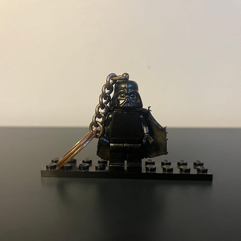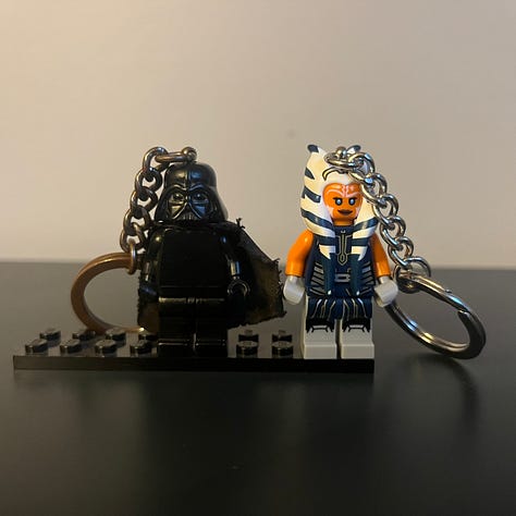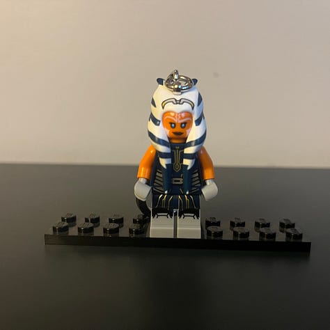 Since there’s plenty of LEGO talk today, I’ve had this LEGO Darth Vader keychain on my backpack for years. It’s beat to hell. The paint or print has worn off the front. Vader’s legs are loose and he doesn’t really standup on his own. That’s why I had to get the little flat piece to put him on. It was finally time for a replacement. And who better than Ahsoka herself.