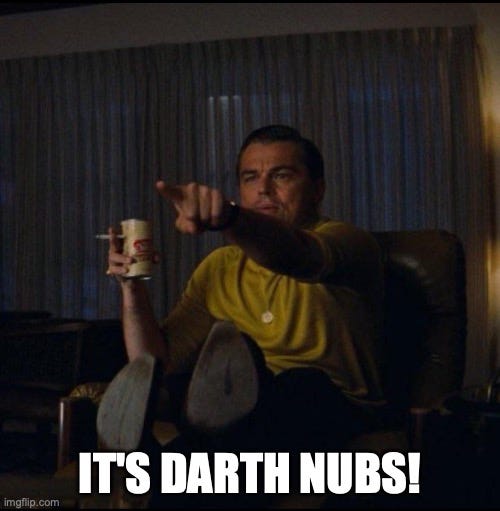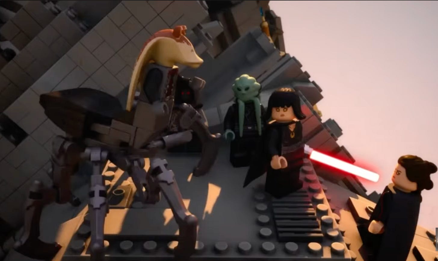 and friend of Death Star HR is don’t just regurgitate the plot. People can watch it for themselves. But instead write about how a book or movie or TV show makes you feel, write about your reaction to it. It’s honestly some of the best advice I’ve gotten on Substack.The thing about something like Pieces of the Past though is, there’s not a lot to react to on an emotional level. The show isn’t Andor, nor is it trying to be. It’s like if you were a restaurant reviewer, and you’re trying to give a review on a bag of Skittles2. There’s nothing wrong with some Skittles, but they’re empty calories. Don’t get me wrong, I enjoyed Pieces of the Past, it’s a lot of fun. And I enjoyed it for the exact reason you’re supposed to. Pointing at the screen when you see something fun. So just fire up Disney+, click over to Rebuild the Galaxy: Pieces of the Past, and enjoy the return of Jaxxon T. Tumperakki, the Porgils, Pirate Queen Amidala, and of course, Spider Legs Darth Jar Jar,