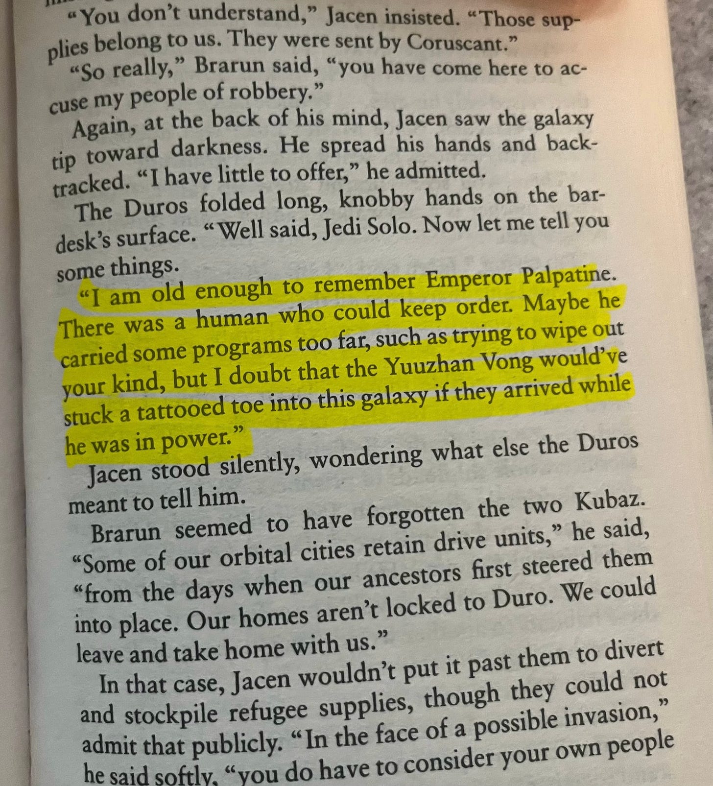 However, and there’s always a however, the galaxy is in a literal intergalactic war and is fighting for their very survival. Maybe, just maybe, Jacen needs to suck it up and be a Jedi. As I was reading the book and Jacen’s looking inward, I wondered if this was a reflection on the War on Terror and a metaphor for debate of just how “tough” the US was supposed to be. If we’re in a must-win war (as it was viewed at the time) do the ends justify the means or do we lose a piece of what it means to be American, or a Jedi, if we’re torturing our enemies or using the Force in a way that could be perceived being on a path to the Dark Side. Of course, the book was published approximately 10.5 months before the 9/11 attacks that kicked off the War on Terror, so either Kathy Tyers is a Jedi, or I’m just reading something into the book that wasn’t there.