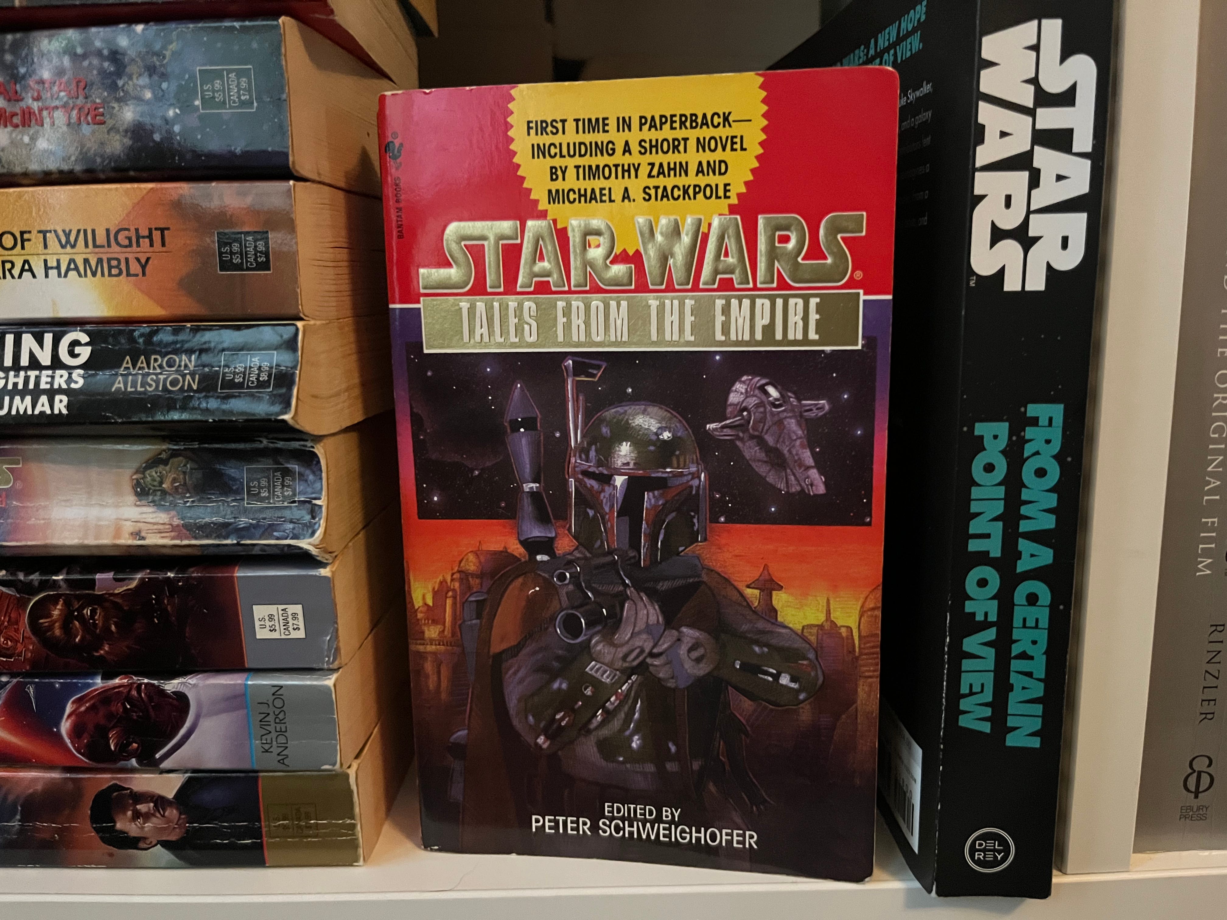 There were five books in the Tales of/from series. Mos Eisley Cantina, Jabba’s Palace, Bounty Hunters, Empire, and New Republic. I’ve read all of them but the last one. I thought I owned all of them but according to my spreadsheet2, I actually don’t own Mos Eisley Cantina. Anyway, Tales From the Empire is really a book for the sickos. At least Cantina, Jabba’s Palace, and Bounty Hunters all have characters that get some screen time in the movies, even if it’s just half a second while the camera is panning. Tales From the Empire is either new characters or ones that you have to have read a bunch of books to know.