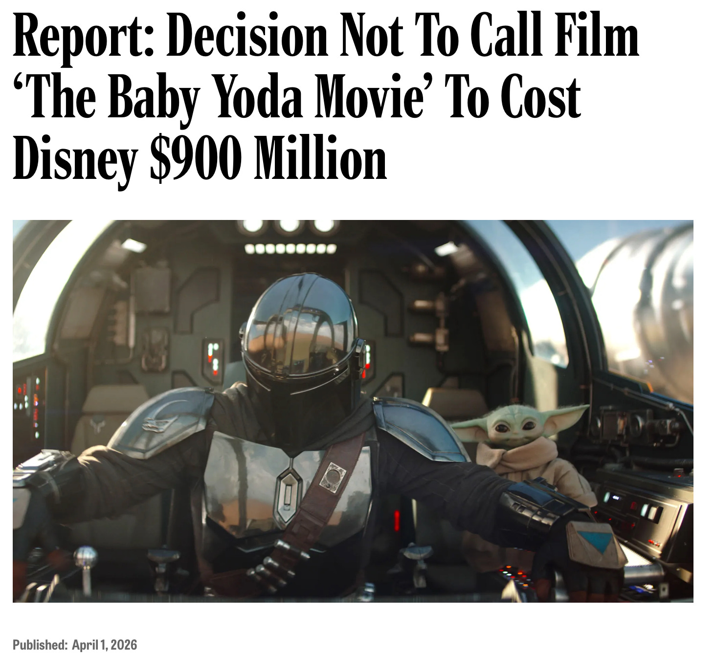 “By naming the film The Mandalorian And Grogu, Disney is leaving money on the table from consumers who have no idea who Grogu is but would immediately take out their phones and buy a ticket for any movie of any genre with ‘Baby Yoda’ in its title,” said report author Heather Flynn, who cited a poll in which 81% of potential moviegoers responded “Who the hell are they? Is this a Lord Of The Rings thing?” when presented with marketing materials for the upcoming film.