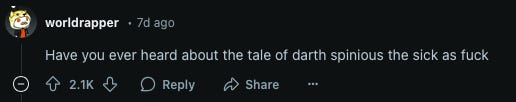 Long time real-life and Death Star HR friend Darth Vo sent me this link. Since Substack doesn’t allow you to embed Reddit videos, you’ll have to click the link. If Star Wars ever wanted to translate some of the Visions cartoons into live action, they should probably give this guy a call.