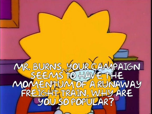As I usually relate things to The Simpsons, I just kept thinking of the early episode where Mr. Burns runs for governor of whatever state Springfield is in.